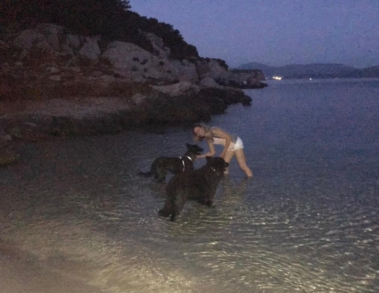 Capito no? Io faccio il possibile e l’impossibile per non lasciarlo in pensione senza di noi… E allora che si fa? Si fanno le vacanze insieme! Non nego sia un pò stressante in alcuni momenti. Ad esempio se la vacanza in campagna, nella nostra casetta con grandi spazi esterni, è stata perfetta per i canetti e per noi, quella in Sardegna (da dove sto scrivendo), è parecchio più difficile! Anche il viaggio in sè non è stato facile. La partenza dal porto di Civitavecchia alle 15 del pomeriggio con attesa di due ore in un piazzale di asfalto bollente (facevano 40 gradi) in mezzo a una giungla di lamiera, non è stata piacevole nè per noi nè per loro. La mia pluriennale esperienza di viaggi in traghetto verso la Sardegna, mi consente di sopravvivere più o meno serenamente: so dove sono i pochi spazi verdi dove portarli a fare pipì, so quando entrare nei locali con aria condizionata del porto per farli rifiatare un pò, conosco perfettamente i tempi dell’imbarco. Ma per chi questa esperienza non ce l’ha, consiglio di evitare a tutti i costi le ore centrali delle giornate estive per fare questi spostamenti. Una volta saliti in traghetto, poi, non è che le cose siano facilissime. Il traghetto è ormai il mezzo di trasporto per eccellenza per noi proprietari di cani e, nel periodo estivo, al sovraffolamento di persone si accompagna anche il sovraffollamento di cani!! Sono sincera noi prendiamo la cabina con accesso animali, sacrifichiamo qualche giorno di vacanza perchè il costo è davvero alto, ma almeno viaggiamo sereni. Tutto sarebbe più facile se le regole venissero rispettate da tutti, intendo se tutti i cani fossero sotto controllo e viaggiassero con la museruola. Noi viaggiamo così:
